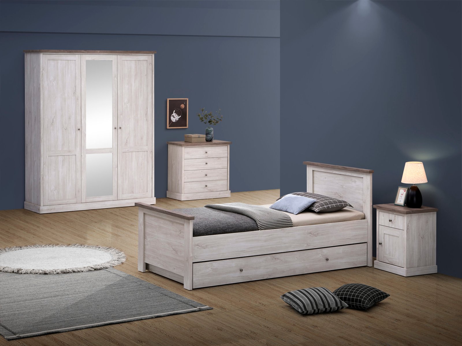 L’armoire 3 portes Eline offre un espace de rangement plus généreux pour les chambres qui nécessitent davantage de place. Son design en chêne clair aux lignes sobres s’harmonise avec l’ensemble de la collection Eline.