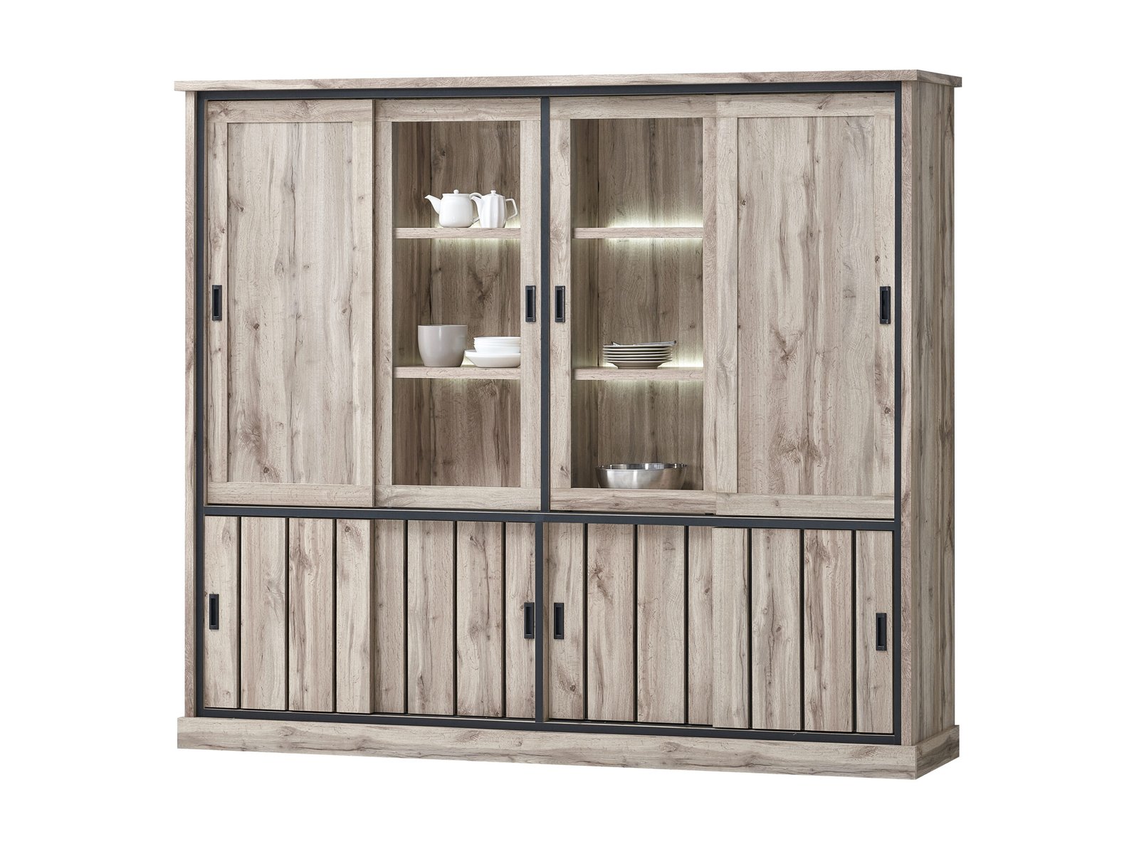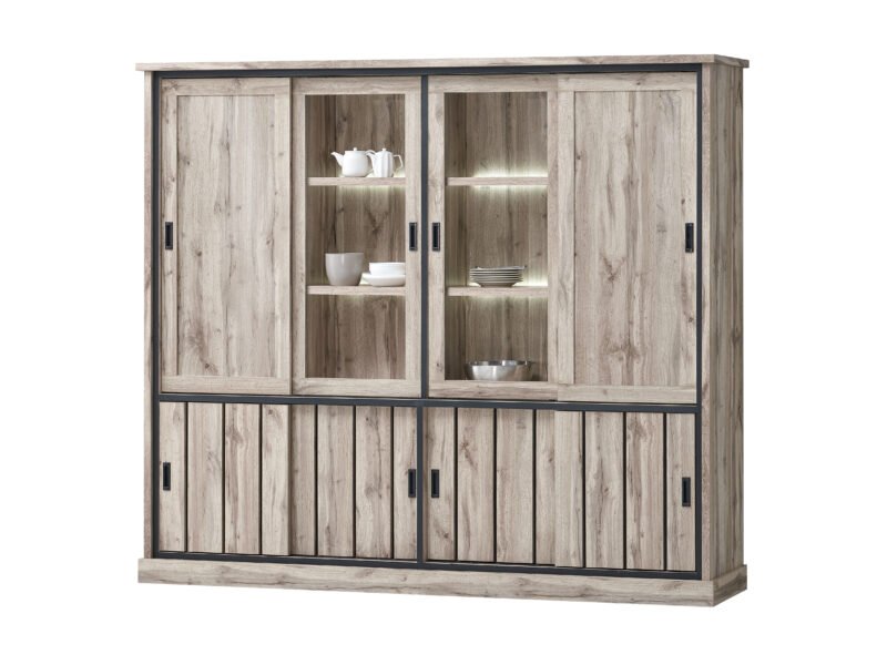 Le living Elena est la pièce maîtresse de la collection. Ce grand meuble de rangement combine deux portes vitrées éclairées par des LED intégrées et deux portes pleines à lattes verticales, le tout rehaussé d accents métal noir sur bois clair.