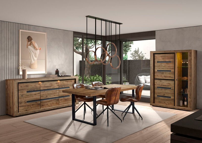 Le bahut spacieux vous permet de ranger aisément votre vaisselle et vos accessoires tout en les conservant à portée de main. La vitrine, élégante et raffinée, met en valeur vos objets décoratifs préférés et vos collections tout en les protégeant de la poussière et des dommages. La table, pièce centrale de cet ensemble, est conçue pour accueillir confortablement vos invités, garantissant ainsi des moments agréables autour d’un bon repas.
