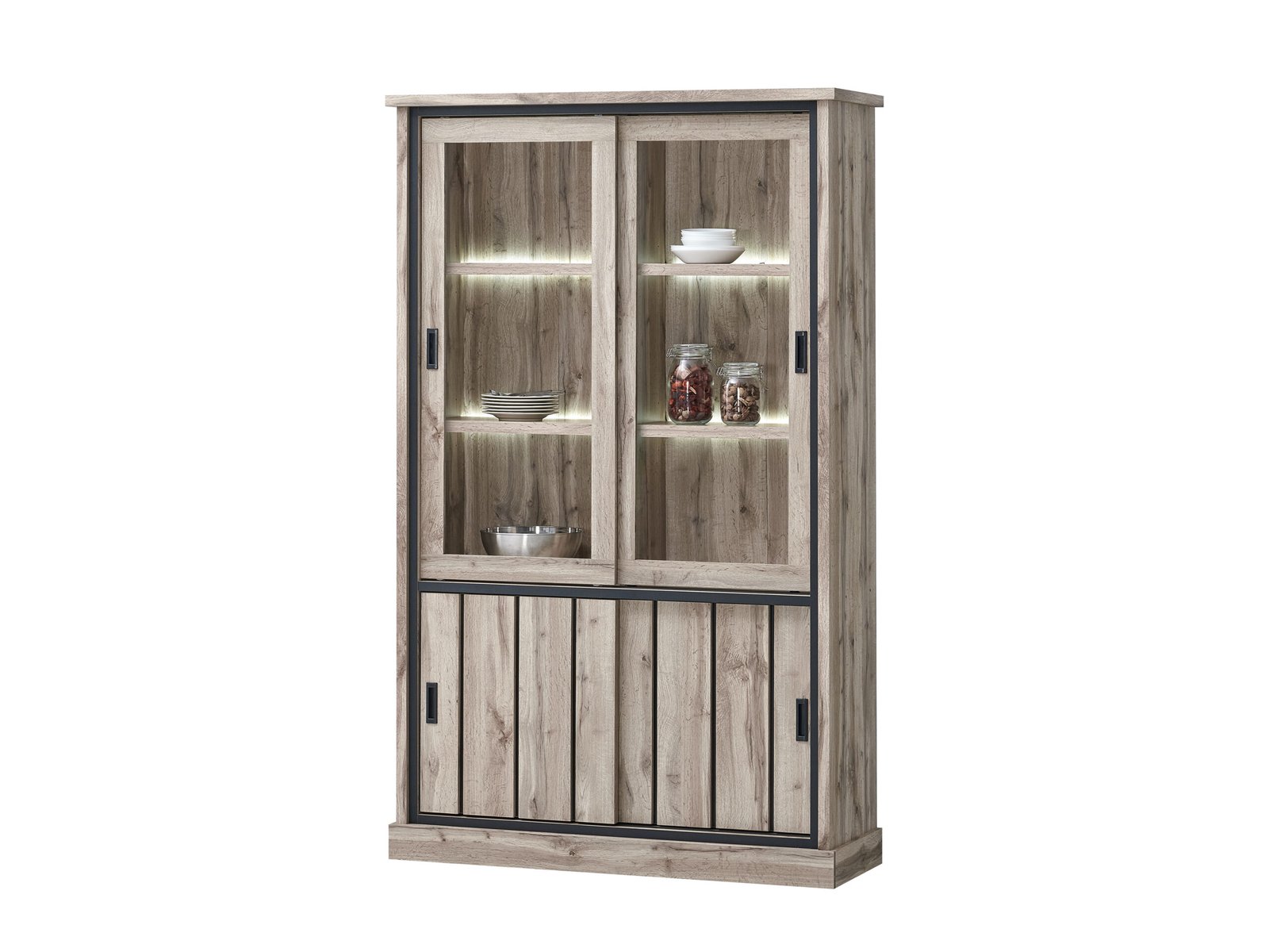 La vitrine Elena met en valeur vos plus beaux objets derrière ses deux portes vitrées éclairées par des LED intégrées. La partie basse, habillée de lattes verticales en bois clair et d accents métal noir, offre un rangement discret et élégant.